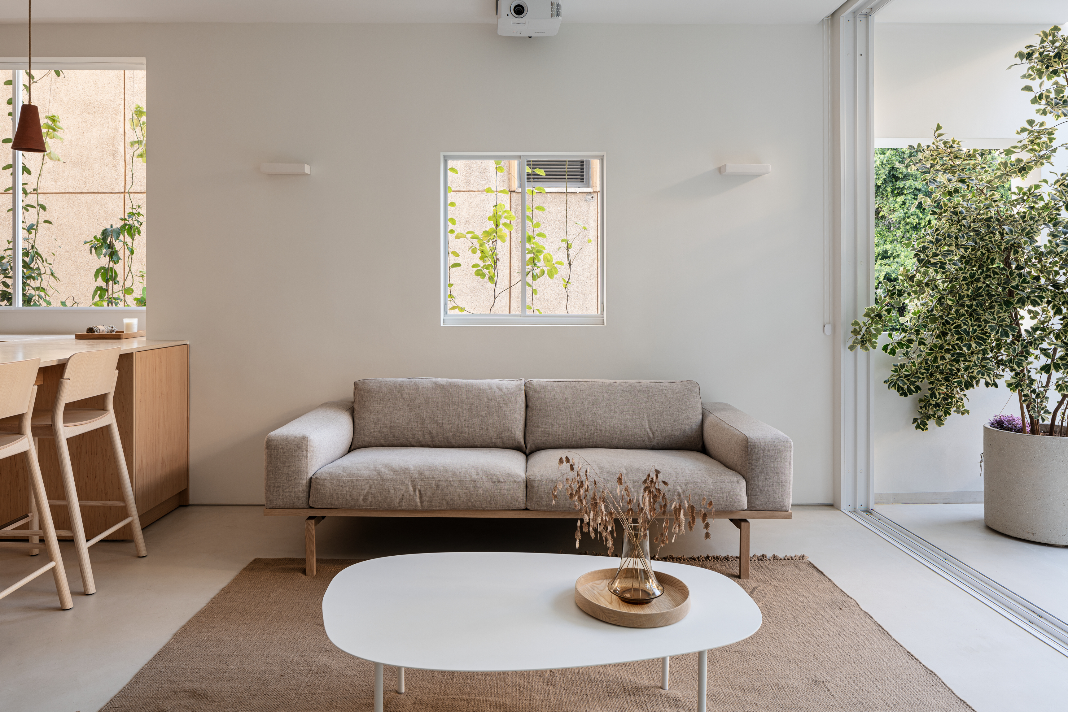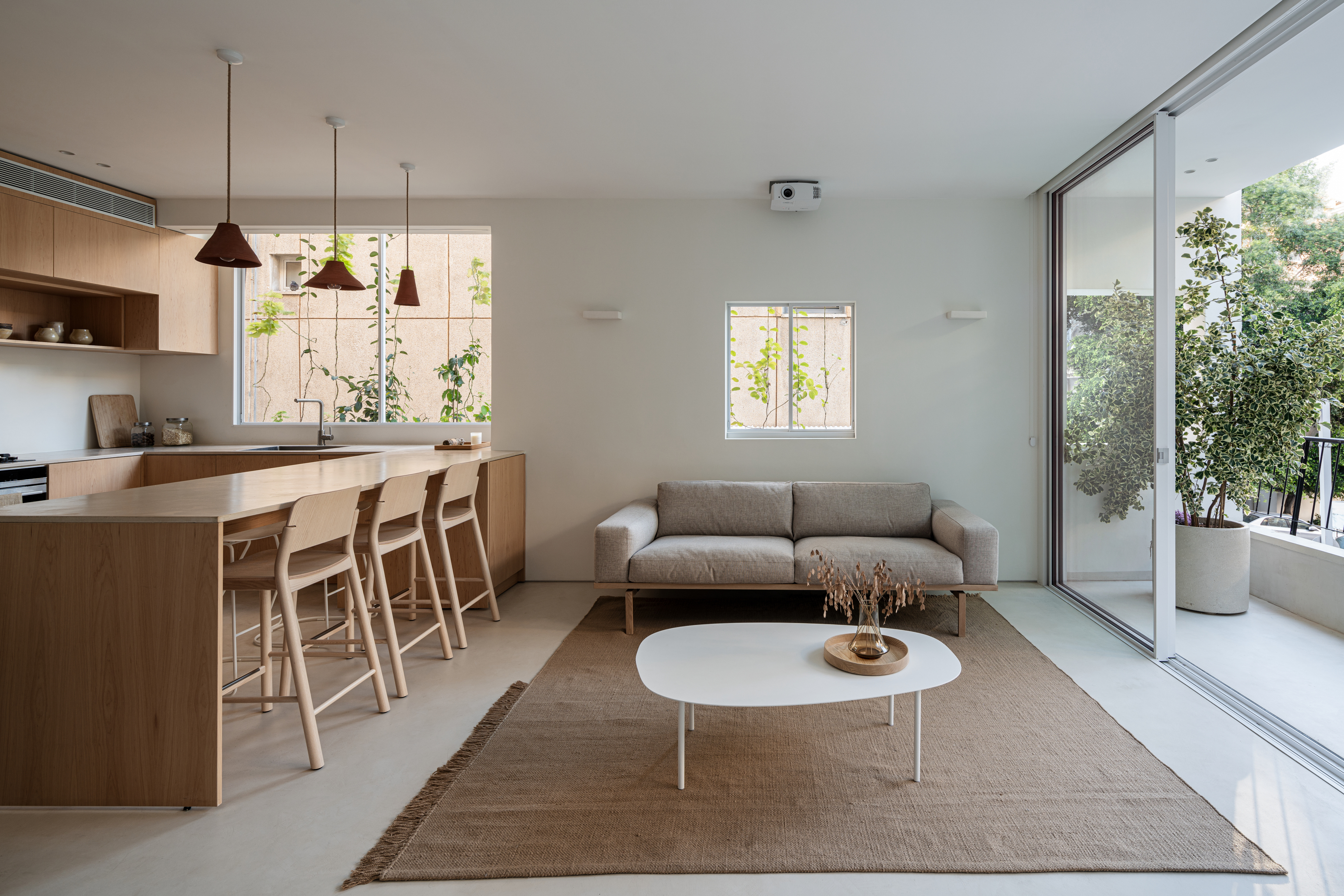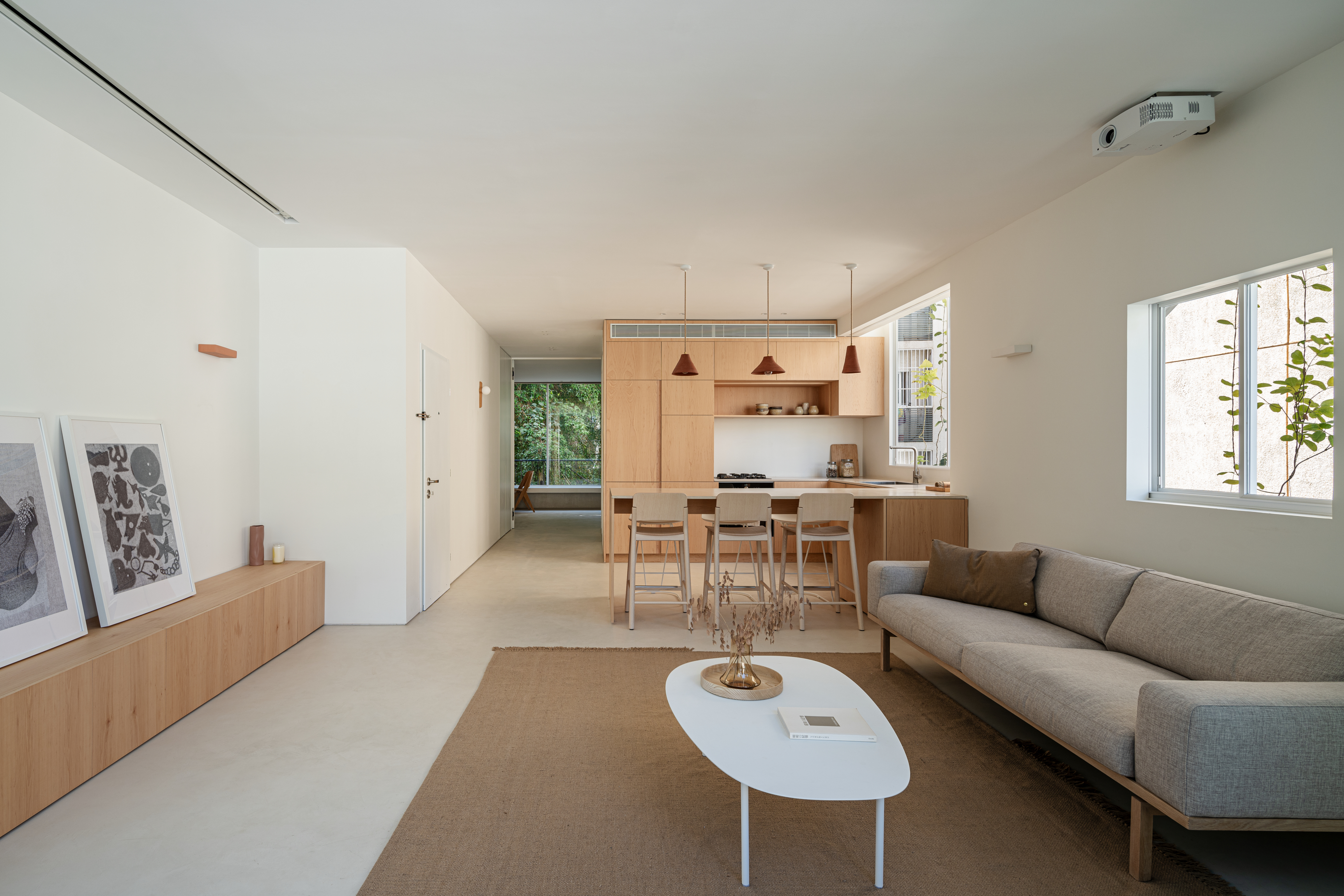 The layout of the apartment was previously divided into four small spaces. These were transformed into empty, open spaces following the principles of simplification and reduction that form the basis of the new design. The two opposing dominant facades at the ends of the apartment guided the design process, starting with opening the space between them to introduce natural light and abundant vegetation into the interior.